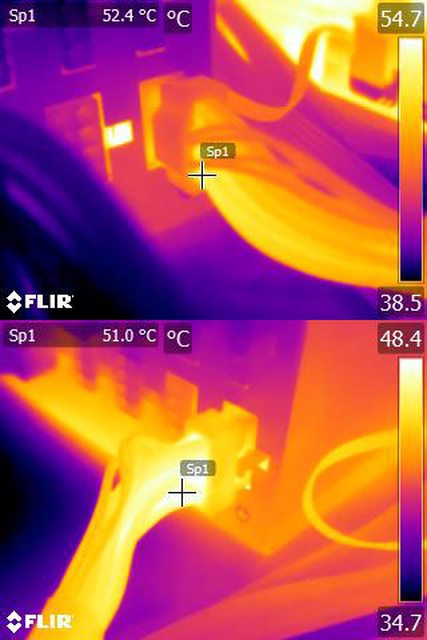 ▼單條PCIE 6+2P連續輸出21A(252W)10分鐘後的電源端模組化接頭紅外線熱影像圖(附註