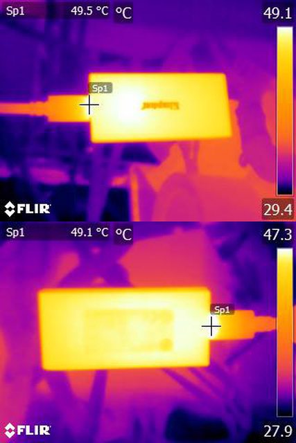 度最高時外部紅外線熱影像顯示高溫點不在外殼而是在連接器處,表示熱量未充分傳導至