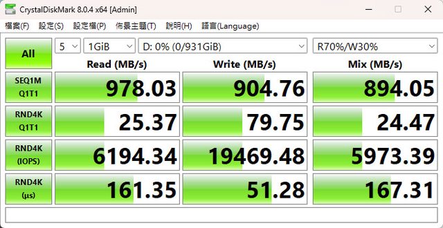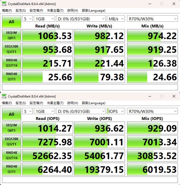 ▼CrystalDiskMark預設(NVMe)+Mix(R70%/W30%)傳輸速度測試