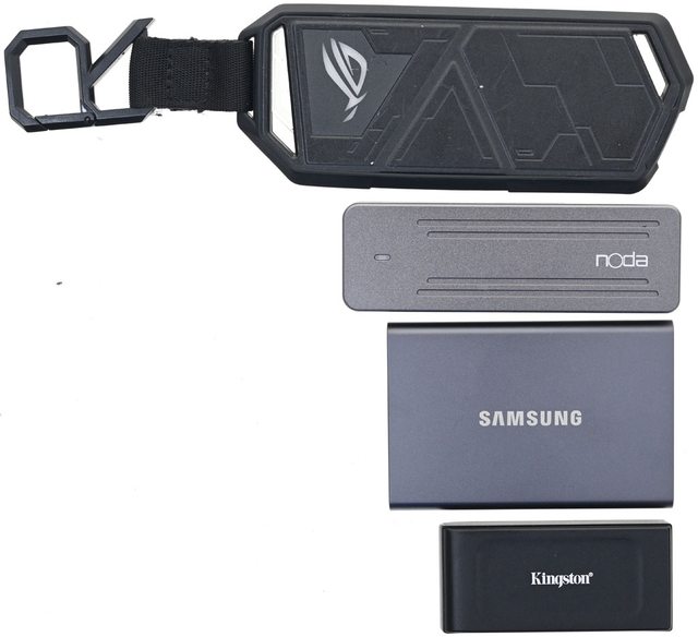 ▼Kingston XS1000(下一)與ROG STRIX ARION(上一)、noda R9(上二)、SAMSUNG T7(下二