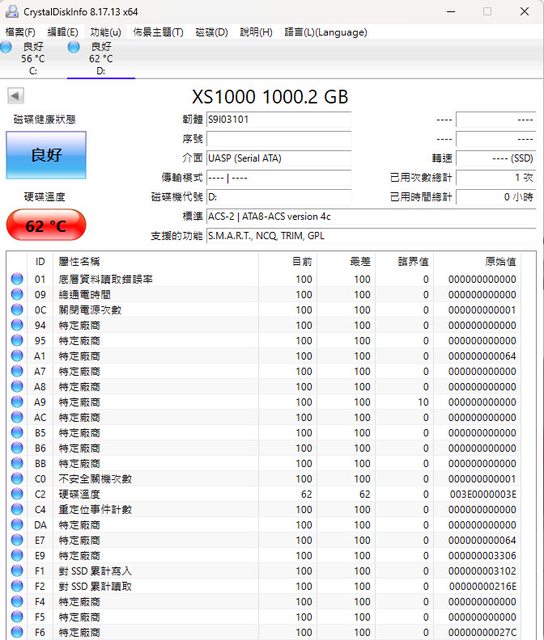 ▼第1次複製時CrystalDiskInfo溫度數據達62°C