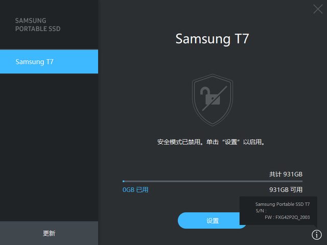 ▼SAMSUNG PORTABLE SSD軟體,可用來顯示裝置資訊、重新命名、已用/可用空間、安全