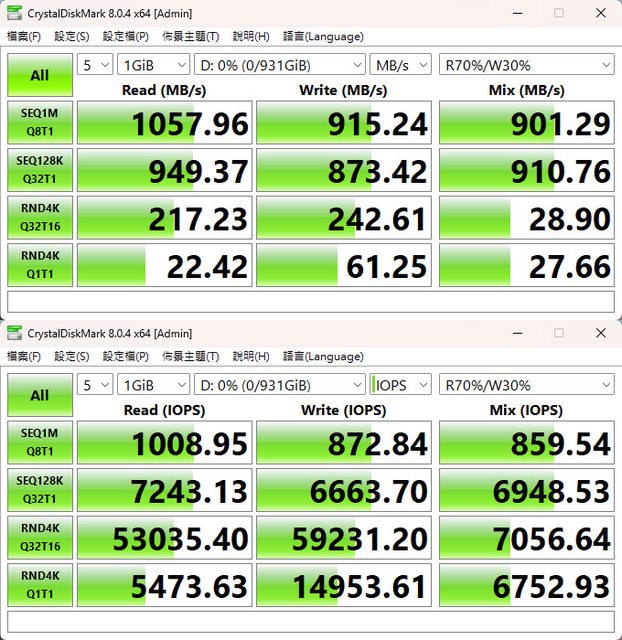 ▼CrystalDiskMark預設(NVMe)+Mix(R70%/W30%)傳輸速度測試