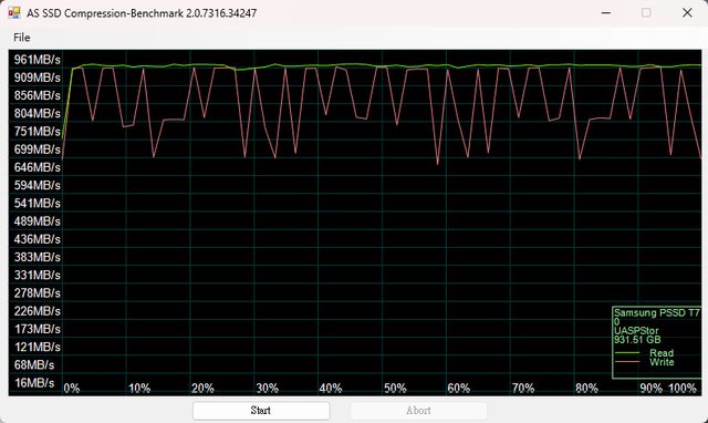 開始後進度15%時降速到714MB/s附近,到25%時速度稍微回升,維持到測試結束