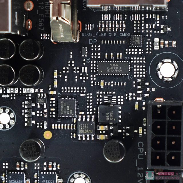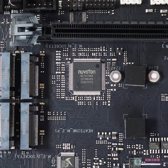 NUVOTON NCT6798D SUPER I/O 晶片,負責多項電壓 / 溫度 / 風扇轉速監測,同時提供多