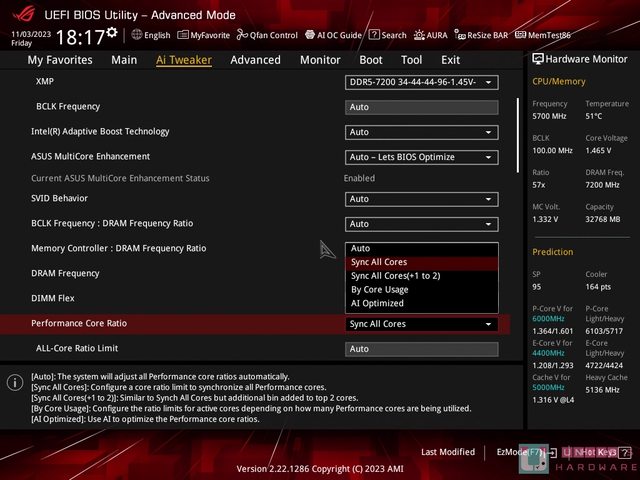 顆 P-Core 同步頻率,可以將 Performance Core Ratio 設定成 Sync all Core,這樣做可