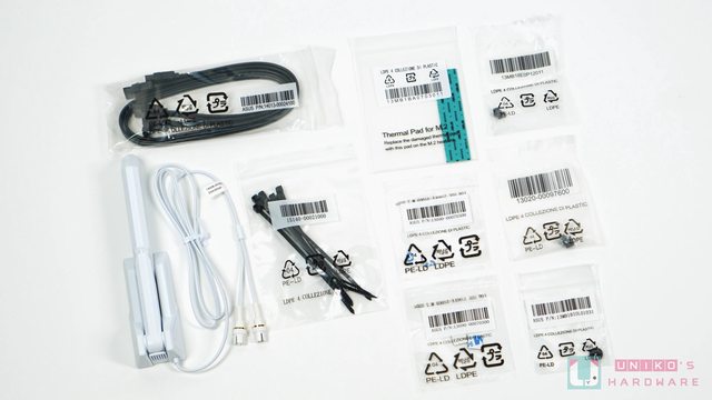 、多根束帶、1 塊 M.2 導熱貼、4 個方形的 M.2 背膠、1 個圓型的 M.2 背板背膠、1 顆