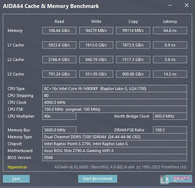 AIDA 64 的處理器和記憶體快取相關資料,記憶體頻率是 DDR5-XMP 7200 ,讀取 106.64
