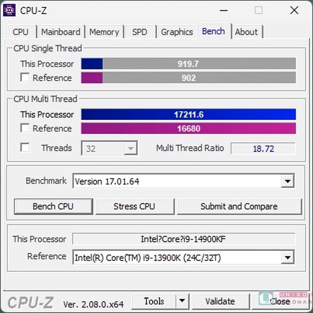 CPU-Z 單核心分數為 919.7、多核心分數為 17211.6。
