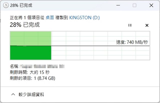 以10GB左右傳輸約740MB/s 15秒左右傳輸完畢