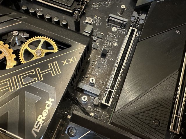 把主機板上第一組散熱片拆下可看到安裝M.2的插槽,1和2是做在一起的,擇一安裝
