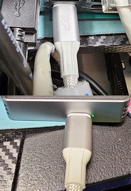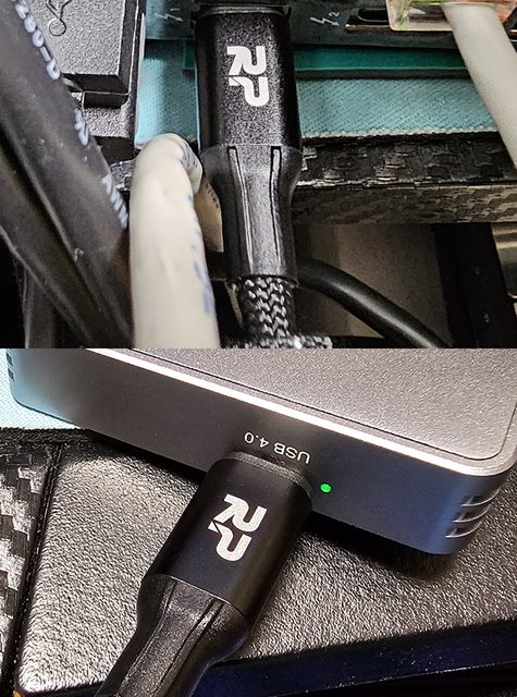▼黑色款線材一端接上主機板後方USB3.2 Gen2x2埠(上圖),另一端接上銀欣MS12外接盒(