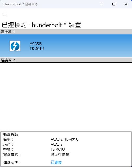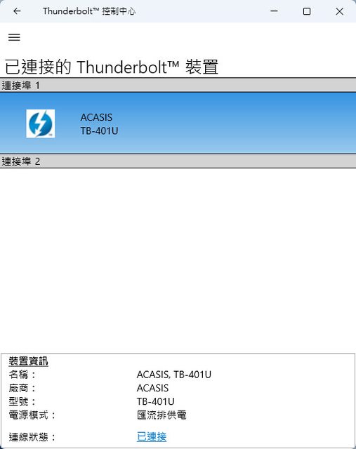 ▼Thunderbolt控制中心會顯示連接埠1已連接ACASIS TB-401U