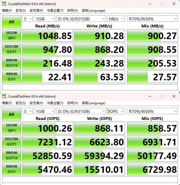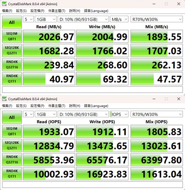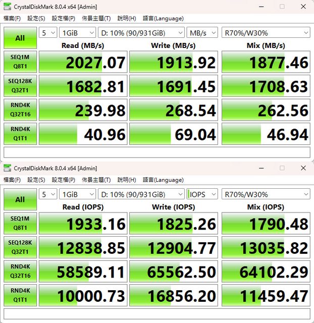 CrystalDiskMark預設+R70%/W30% Mix測試