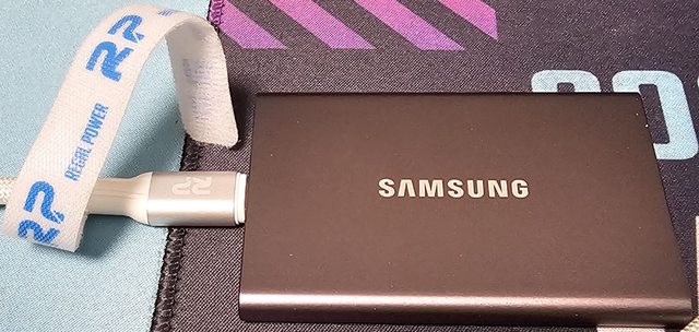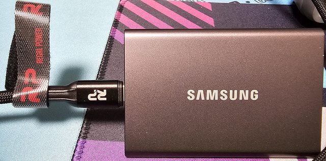 ▼主機板USB3.2 Gen2x2埠經黑色款線材連接SAMSUNG T7 1TB外接式SSD的