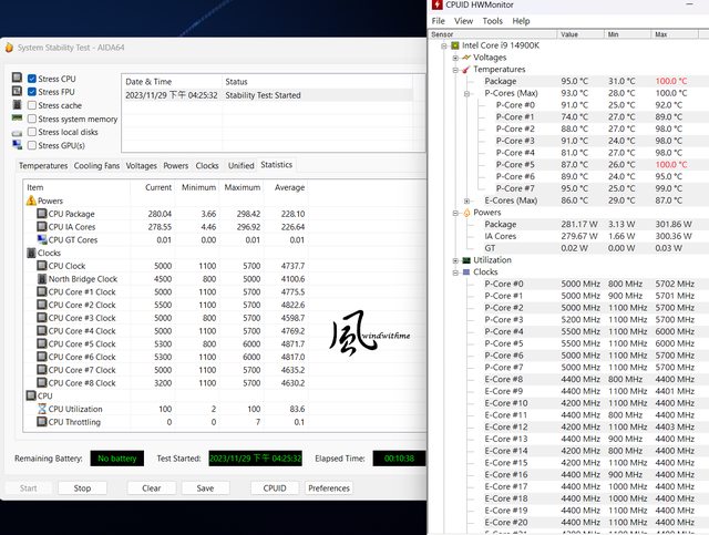 Package顯示281.17W,P-core約74~95度,時脈約5~5.5GHz;E-core約86度,時脈約