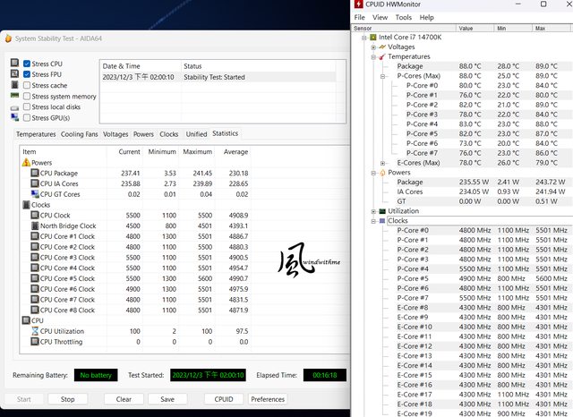 235.55W,P-core約73~88度,時脈約4.8~5.5GHz;E-core約78度,時脈約4.3GHz。