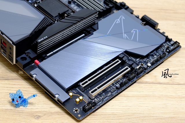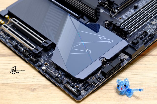 晶片組與周圍4 個Gen 4 M.2插槽散熱藉由AORUS大型金屬散熱裝甲,下方有4顆狀態指示