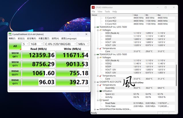 搭配InWin MR36一體式水冷擁有不錯的散熱能力,並透過AORUS Gen5 12000 SSD 2TB讓系