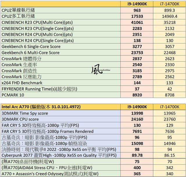 本篇Intel Core i7-14700K與i9-14900K效能實測對比表格:
