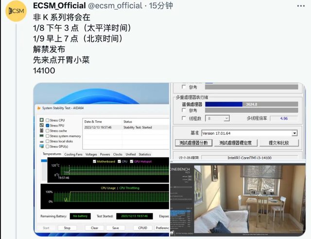 放出了英特爾 i5-14400 和 i3-14100 的測試資料
