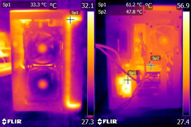 ▼正面安裝網孔板,由正面、右側前方及底部進風時,CPU+GPU高負載30分鐘後的正面(左