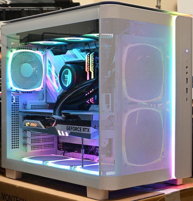 ▼正面安裝網孔板及加裝2個白色款AX140 PWM風扇時的正面燈光照明效果