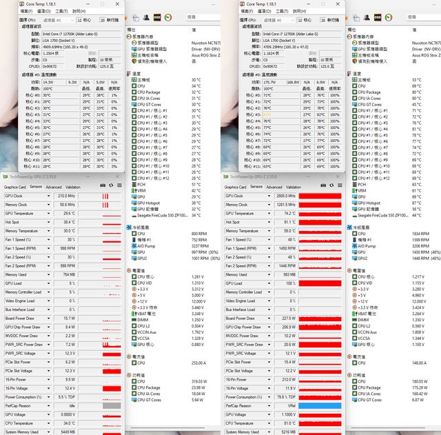 接下來進行兩種安裝配置的CPU+GPU高負載前/後溫度比較