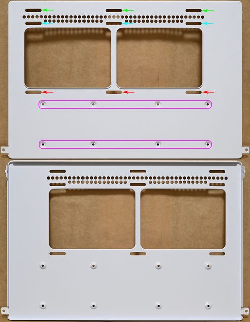 ▼右艙頂部有通風網孔,左艙頂部固定架兩側有4個螺絲(紅色箭頭),拆卸後可取下固定