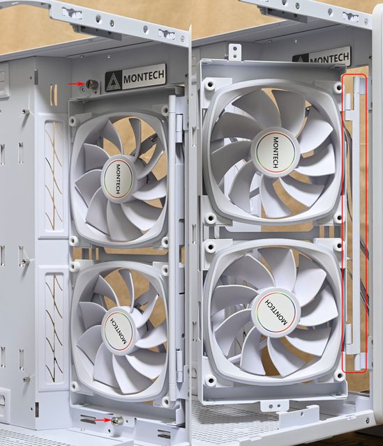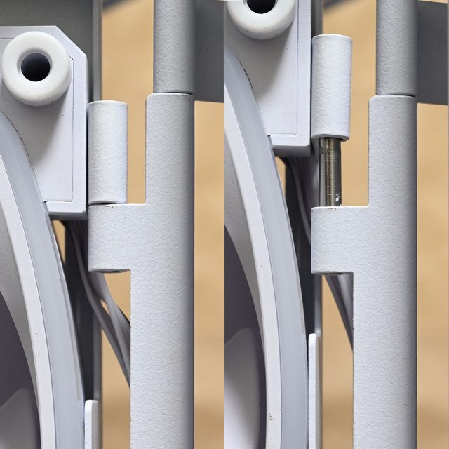 ▼右側前方固定架轉向至正面並加裝2個白色款AX140 PWM風扇時,可把原本2個白色款