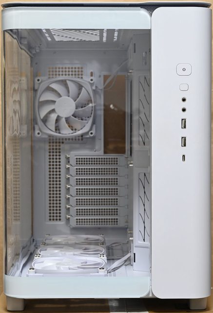 ,右艙風扇/2.5吋蓋板可額外提供2個風扇安裝空間(最多11個風扇)。右側前方預裝2個白