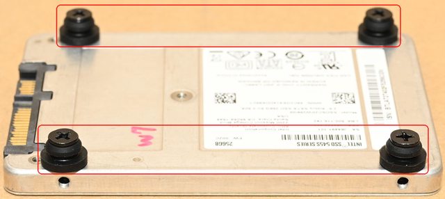 ▼安裝2.5吋裝置前,先在底部鎖點裝上4個2.5吋專用螺絲及墊圈(紅色框,墊圈直徑小的
