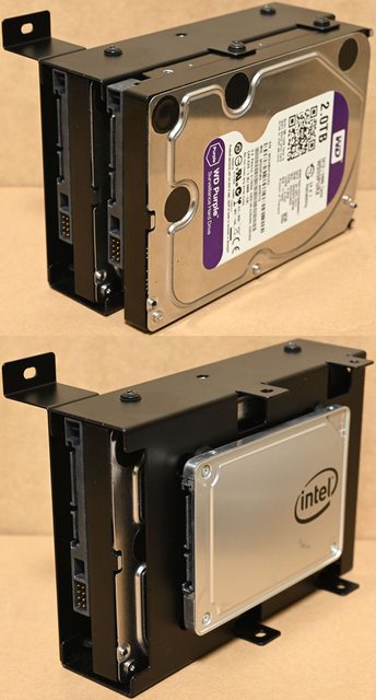 ▼3.5吋/2.5吋可拆卸式固定架安裝2個3.5吋硬碟(上)及1個3.5吋硬碟加1個2.5吋SSD(下)