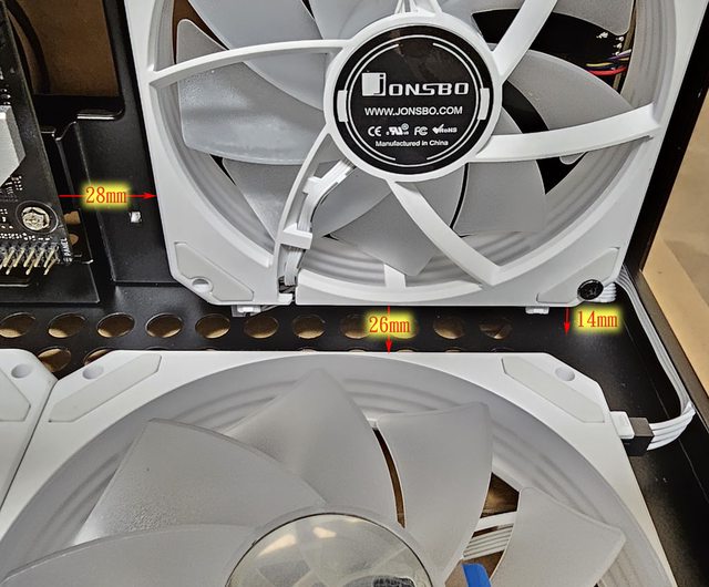 ▼風扇配置一:右側前方3個JONSBO ZG-120魔組扇進氣,底部3個JONSBO ZG-120R反轉魔
