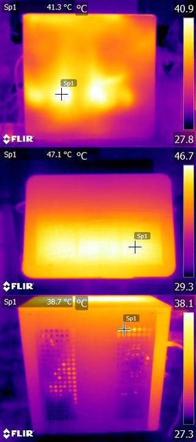 ▼風扇配置一:CPU+GPU高負載30分鐘後的左側(上)、頂部(中)及右側(下)紅外線熱影像