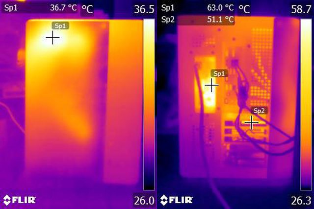 ▼風扇配置二:CPU+GPU高負載30分鐘後的正面(左)及後方(右)紅外線熱影像圖