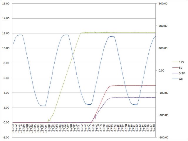 ○電源啟動至綜合全負載輸出狀態,12V上升時間12ms,5V上升時間8ms,3.3V上升時間