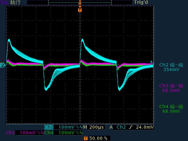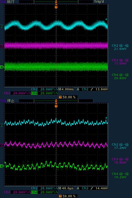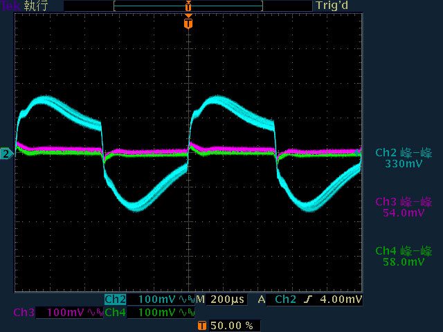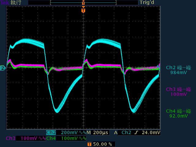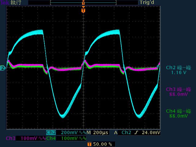 ○輸出無負載時12V有小振幅低頻漣波,輸出12V/2A以上12V漣波波形固定,只改變振幅。