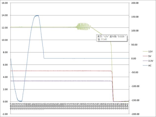 ○綜合全負載輸出狀態切斷AC輸入模擬電力中斷,12V於16ms開始出現波動,於26ms降至