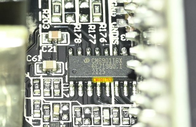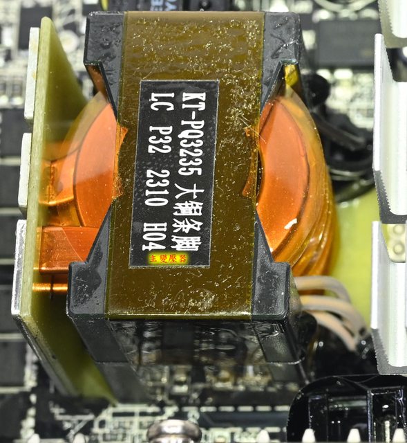 電IC的小電路板。磁芯有包覆套管,交流輸入插座及總開關焊點未包覆套管