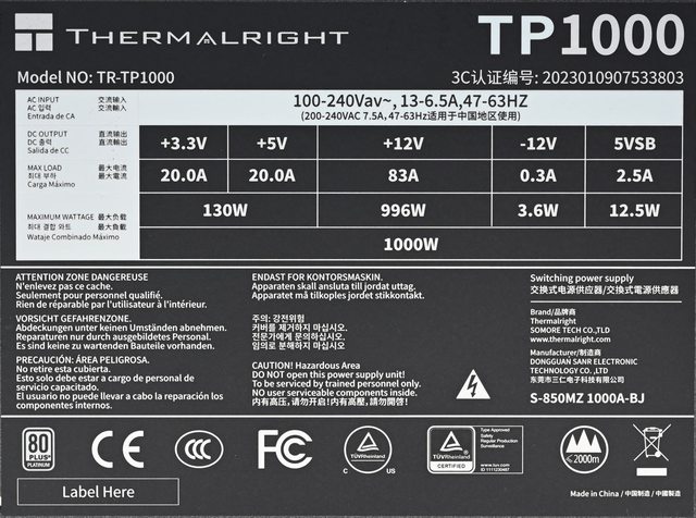 ▼本體背面標籤有Thermalright商標、TP1000名稱、型號、3C認證編號、輸入電壓/電流/