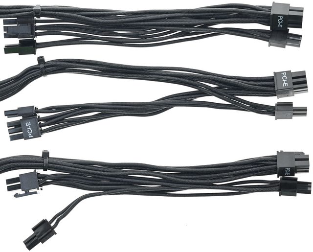 ▼3條顯示卡電源黑色模組化線路,提供6個PCIE 6+2P接頭,至第一個接頭線路長度65公