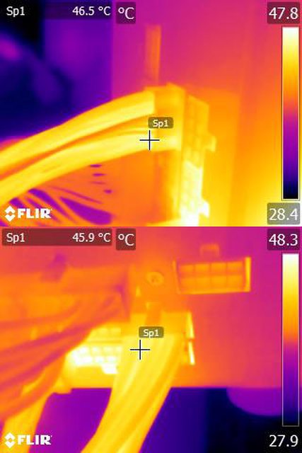 ▼執行FURMARK 30分鐘後電源端插頭的紅外線熱影像圖(附註:安裝位置環境溫度會影響