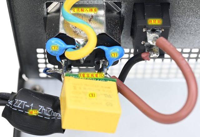▼交流輸入插座焊點加上2個Y電容(CY1/CY2)及1個X電容(CX1),X電容底部加上有X電容放