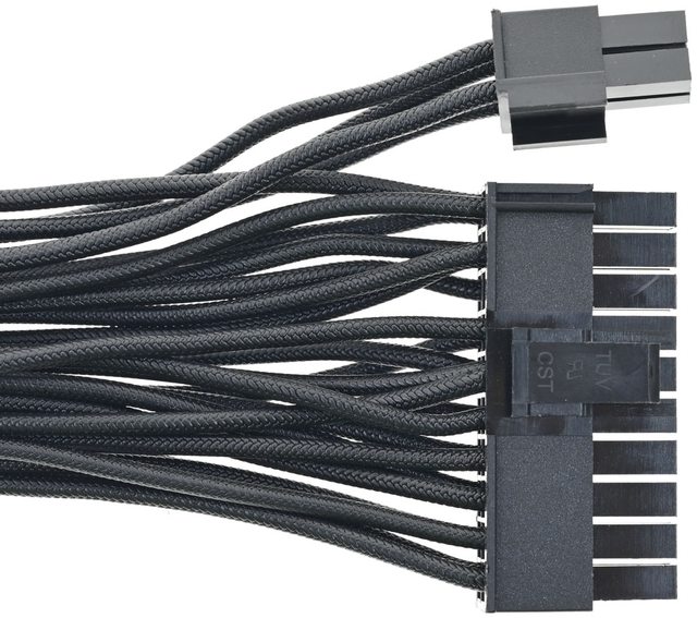 ○14公分短機身全模組化設計,黑色線材在外皮壓印傘繩編織線花紋。提供1個ATX 20+4P