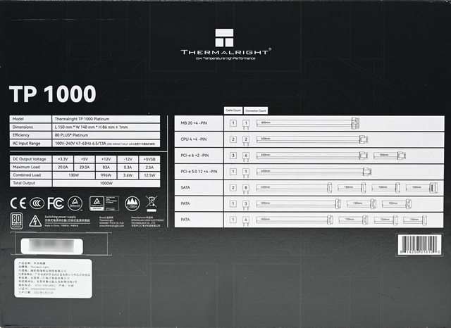 ▼外盒背面有Thermalright商標/標語、TP1000名稱、產品規格表、輸出規格表、安規認