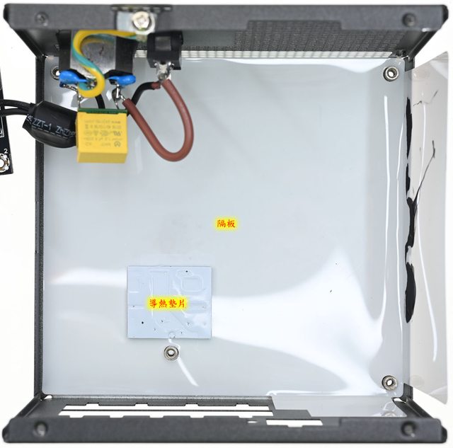 ▼外殼底部乳白色隔板於主電路板二次側區域開孔並貼上導熱墊片