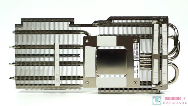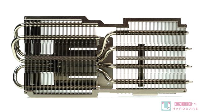 一側鰭片有 4 根熱導管,另一側 (核心晶片上方) 有 3 根。