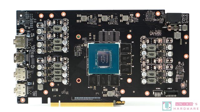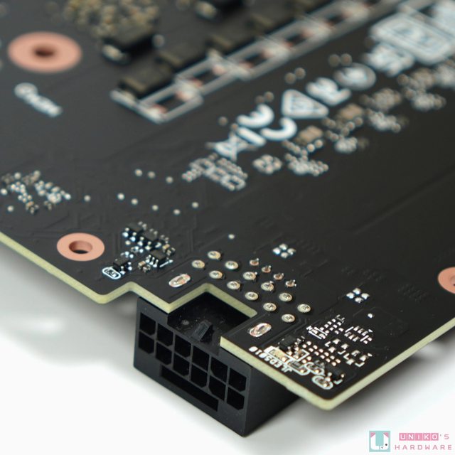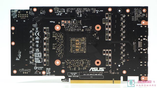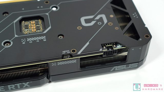 頂部除了被升級的 16-PIN 外,華碩也把風扇外殼延伸至背板,也再次強調 GEFORCE RTX。
