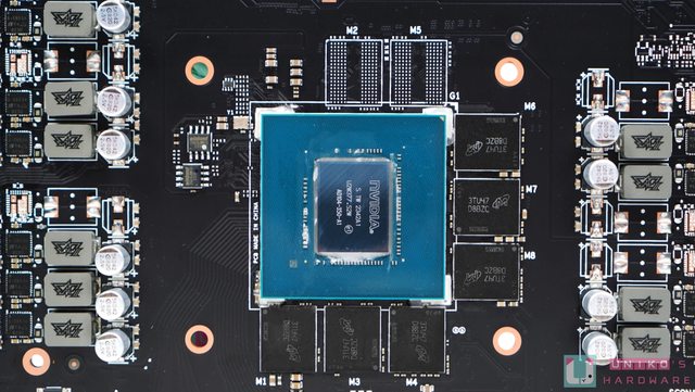 12 GB GDDR6X 由 6 顆晶片負責,都是 MICRON 的 MT61K512M32KPA-21,原生速度達 21 Gb